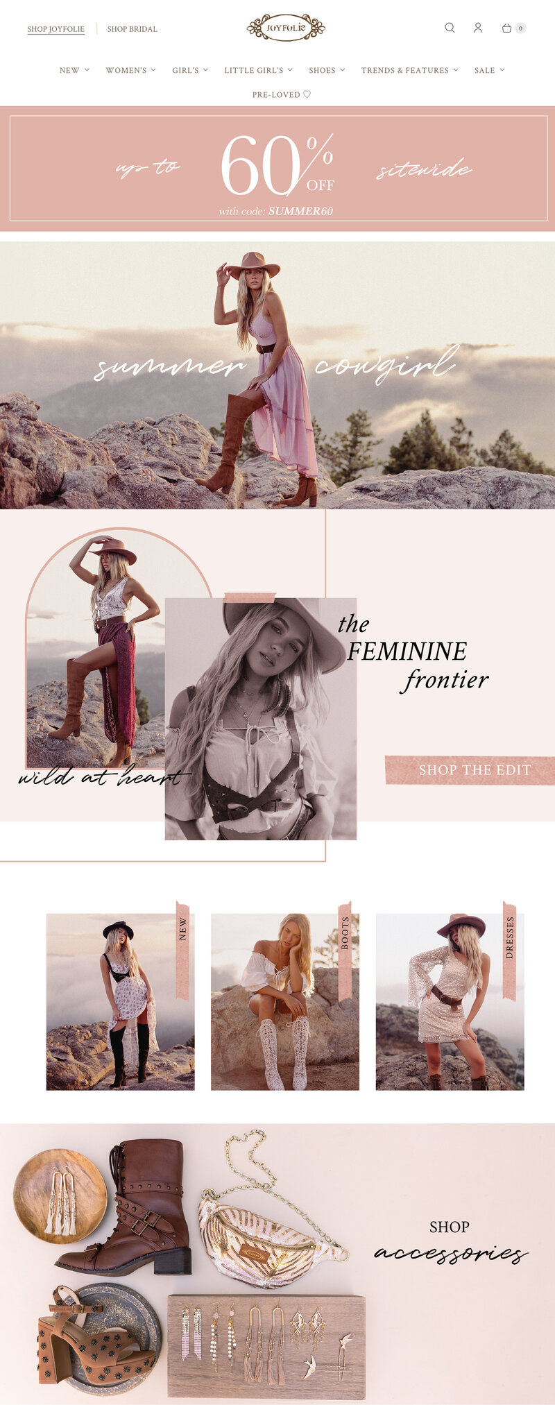 This launch marked the beginning of a new brand era for Joyfolie. As the brand shifted it's focus more towards women's clothing, we stepped into a more daring and expressive space. I created this full suit of graphics to bring the Pink Summer Cowgirl vision to life. From emails to social banners, each asset was intentionally designed to feel cohesive and set the tone for what's next.